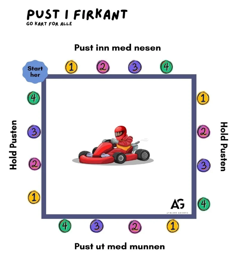 Når du trenger å roe deg ned eller finne fokus før du kjører, kan du “puste i firkant”. Tenk deg at du tegner en firkant i lufta eller inni hodet ditt mens du puster. Du kan også bruke fingeren for å tegne i luften. Alle sidene er like lange, og vi bruker like lang tid på å tegne dem. Vi teller til 4 for hver side.
