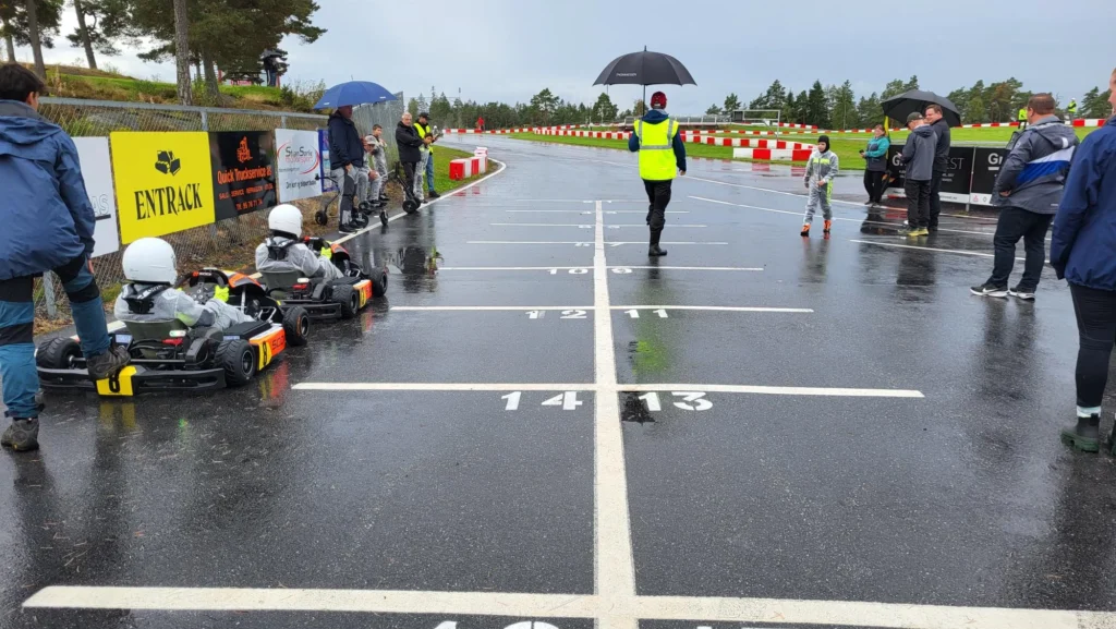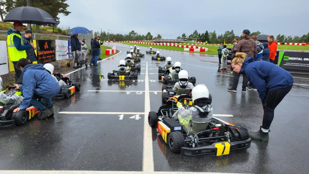Regndekk og våte forhold gjorde det ekstra utfordrende for de unge førerne i «Gokart for alle» på Varna sist søndag 14.9. Treningene startet søndag formiddag kl 10 med våt og opp tørkende bane. Forholdene bedret seg likevel stadig i løpet av de 4 trenings heatene som ble kjørt på formiddagen. Men det er jo nettopp under slike forhold at en lærer og forstår hvordan karten reagerer på en litt mer glatt bane, og hvor grensene for hva karten har av veigrep kan innøves.